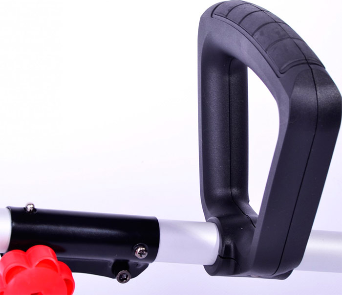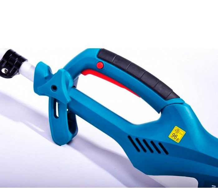 La tondeuse est faite sur une barre droite avec un moteur supérieur. La poignée principale est caoutchoutée et évite de glisser des mains de l'utilisateur. Puissance de l'outil de jardin 1000W pour une productivité élevée.