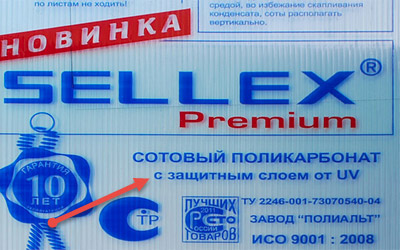 Afin de protéger le polycarbonate cellulaire de l’effet destructeur des rayons ultraviolets sur sa surface extérieure, une couche de substance stabilisant la lumière est appliquée par coextrusion. Vous pouvez vous renseigner sur la présence d'un tel revêtement protecteur grâce aux inscriptions correspondantes sur le film protecteur collé à la feuille de polycarbonate. Vous devez faire attention ici. S'il n'y a pas de marques spéciales sur le film de protection, cela signifie qu'il est conçu pour une utilisation en intérieur.