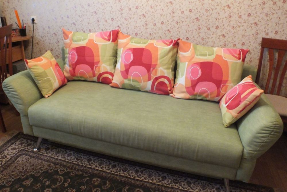 Quand ils se sont mariés, ils ont reçu un studio de leurs parents, ils ont décidé de le meubler avec des meubles pliants. Pour la détente, nous avons choisi un canapé attrayant Malta avec un rembourrage en velours dans une tonalité de café au lait. Immédiatement, j'ai aimé son coût, son confort, sa compacité au montage, sa grande taille dépliée, la douceur du rembourrage. Plus tard, ils ont évalué la présence d'accoudoirs larges en similicuir, un pouf volumétrique qui peut être glissé sous le dos, les jambes.