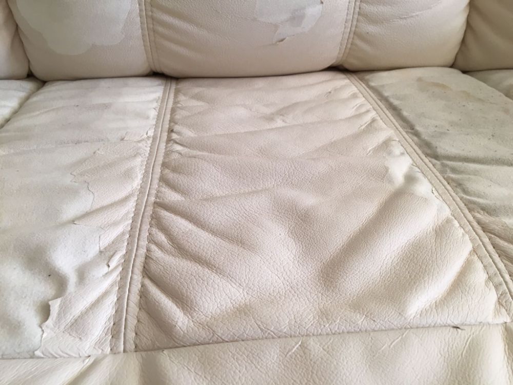 Quelque part en février 2016, la peau sur le canapé a commencé à faire des bulles légèrement / imperceptiblement sur le dos à droite, plus près du 16 juin, la taille des bulles a augmenté et a commencé à se fissurer, puis à la place des bulles, la peau a commencé à s'envoler. Lorsque les volets sont tombés, une nouvelle peau a commencé à s'éloigner le long des bords des volets. En octobre-novembre 16, de nouvelles bulles et fissures ont commencé à apparaître activement, qui se sont révélées être des lambeaux. Les endroits où les bulles apparaissent sont principalement le dos et le siège, se répandant / apparaissant progressivement sur toute la surface où les gens sont assis. Les lésions cutanées sont absentes sur les flancs, dans une couchette (à l'arrière), dans des endroits où il y a peu de contacts. (En même temps, le canapé n'était pas traité chimiquement, il était essuyé avec un chiffon humide et de l'eau tiède)