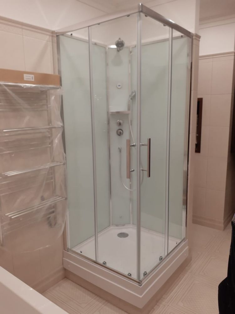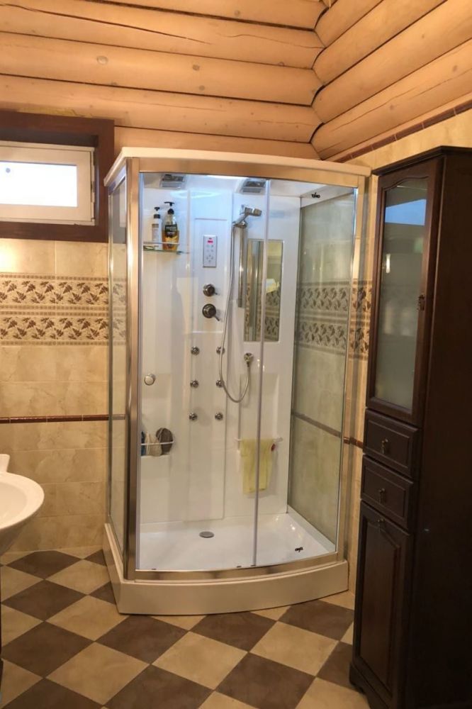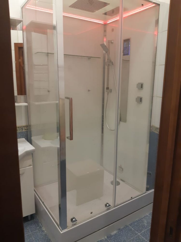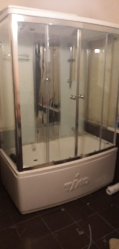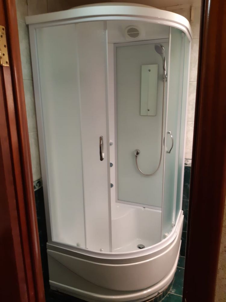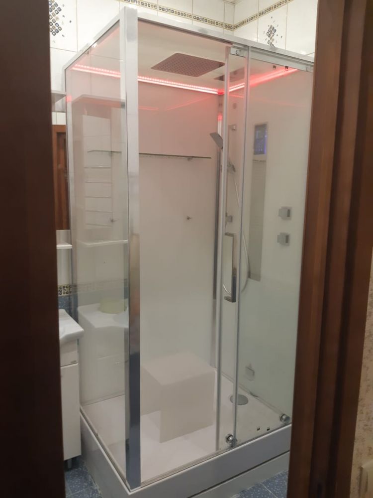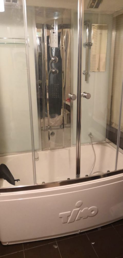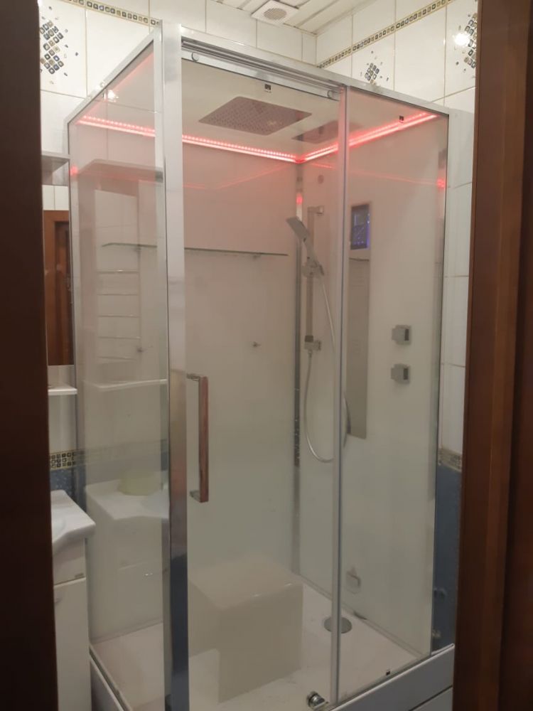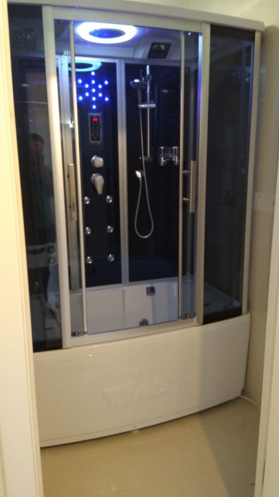 La fonction est nécessaire, cela nous a plu et apprécié. Tout brille ici - à la fois le panneau de commande et le plafond: rétro-éclairage multicolore. Il y a une grande étagère, dommage qu'il n'y ait pas de miroir, mais ce n'est pas critique du tout. Tout est contrôlé depuis l'écran tactile. La cabine prend relativement peu de place.