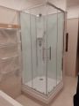 Classiques stricts dans tout: forme rectangulaire, palette basse blanche comme neige. Cependant, lors de l'utilisation d'un seul cas de débordement. Portes coulissantes très pratiques, les poignées sont très ergonomiques, tout est en verre.