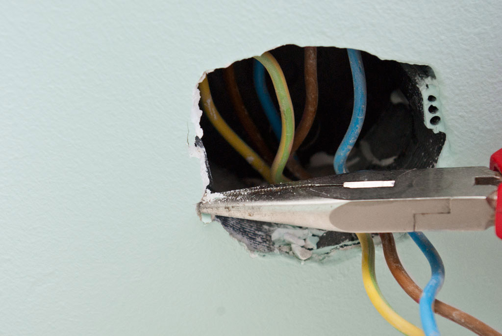 Il est temps de commencer à brancher la prise. À l’aide de pinces, coupez les câbles de manière à ce qu’ils ne dépassent pas de 15 cm du mur, cette longueur devant suffire à permettre de les connecter facilement à la prise. Les extrémités des fils ne doivent pas être laissées trop longtemps, car elles risquent de ne pas tenir dans la prise. Vous devrez ensuite revenir à cette étape et répéter toutes les opérations suivantes.