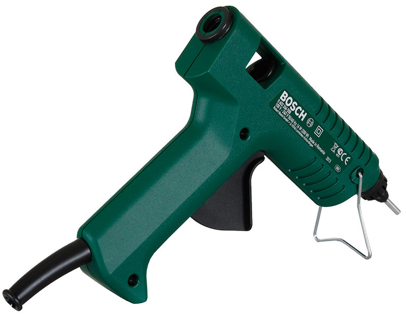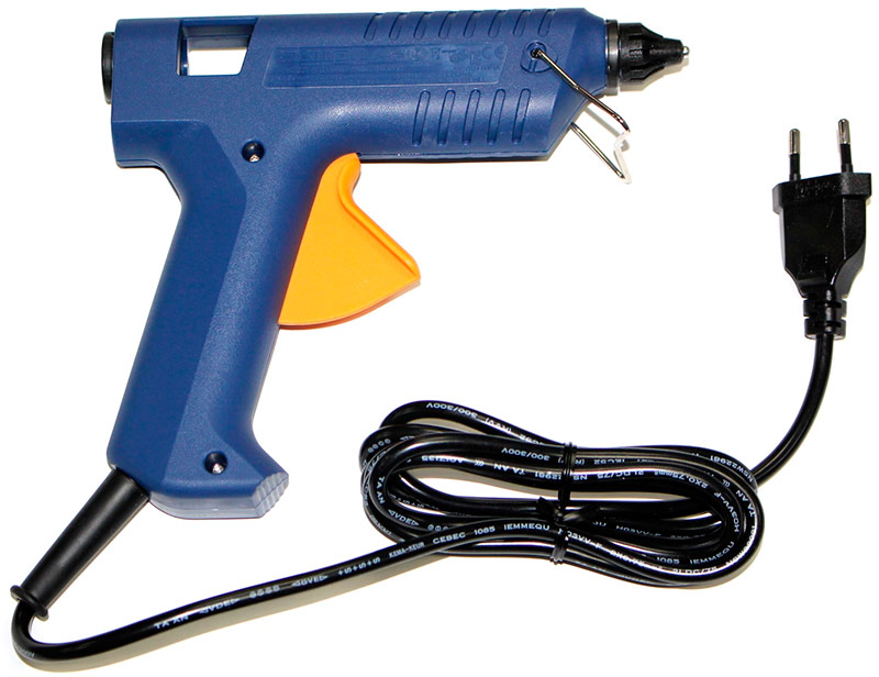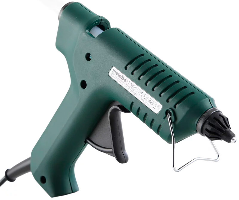 Le pistolet a une conception sûre et pratique avec une gâchette mécanique large, une extrémité arrondie du manche et un pied en métal permettant de fixer un outil chauffant sur une surface plane. Une puissance de 200 W permet une fusion rapide de l'adhésif.