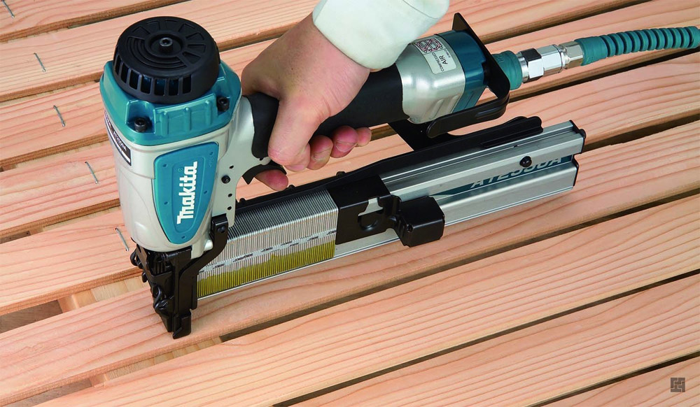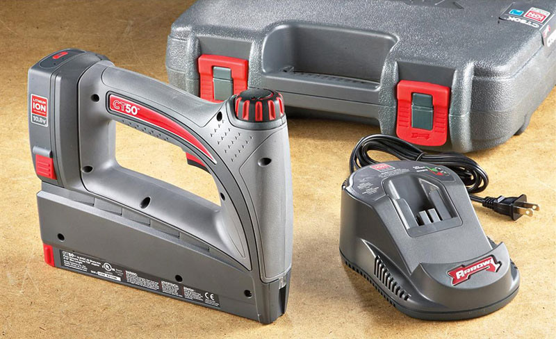 Un outil similaire travaille sur la force de l'air sous pression. Il accomplit sa tâche à la vitesse de l'éclair: une fois - et le support, même le plus long, est déjà très bouché. Mais cela pèse moins que la contrepartie électrique. Il semblerait - que pourriez-vous demander de plus? Cependant, il y a aussi un inconvénient: vous devrez acheter un compresseur avec une agrafeuse, lourde et dimensionnelle. Et de l'argent supplémentaire devra être payé pour lui, et le transférer est assez difficile. Il est donc préférable d’acheter cette option pour le travail à l’arrêt.
