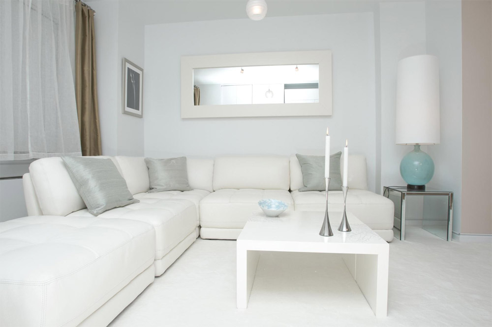 Intérieur élégant en couleurs blanc et gris avec des accents turquoise clair.