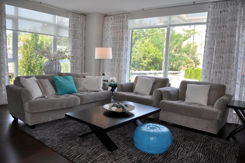 Pouf marocain et autres accents turquoises se détachent bien sur le fond gris général du salon