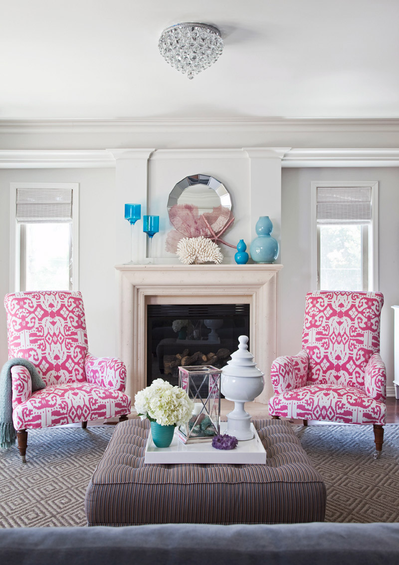La tapisserie d'ameublement rose et les petits accessoires turquoises ajoutent de la luminosité au fond blanc de la pièce.