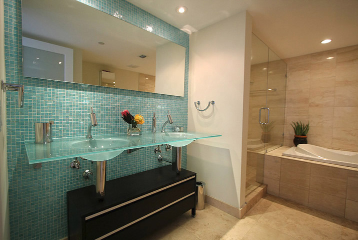 Une légère touche d'aigue-marine dans la salle de bain.