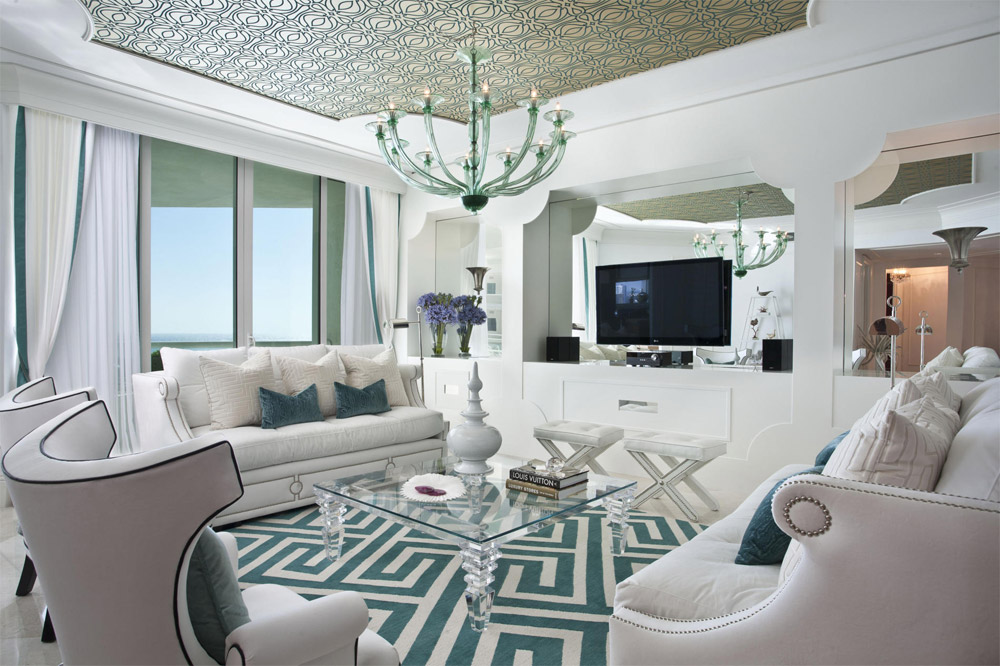 L'intérieur est dans le style de Hollywood Regency ("Old Hollywood") en blanc et turquoise.