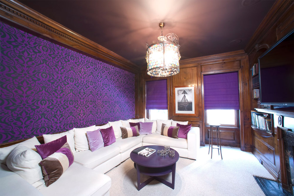 Home cinema, dont l'un des murs est recouvert d'un papier peint violet et est encadré par un cadre en bois massif.