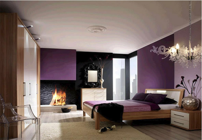 La cheminée ajoute encore plus de luxe à cette chambre violette.