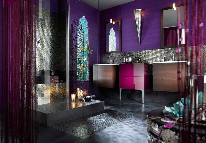 La salle de bain marocaine combine de manière organique diverses teintes de violet.