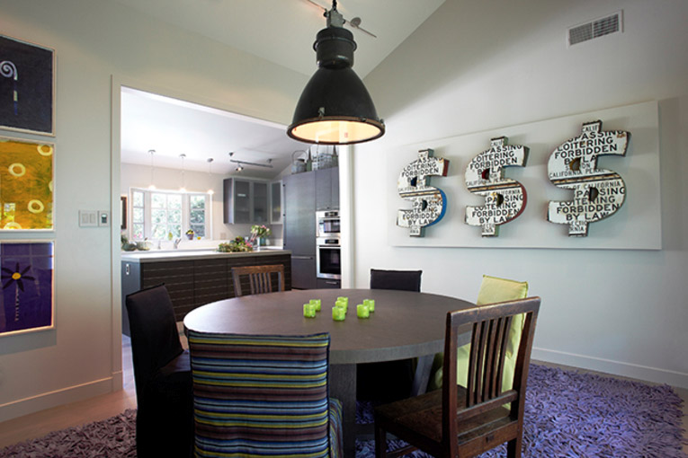 Conception inhabituelle de la salle à manger avec un tapis violet confortable.