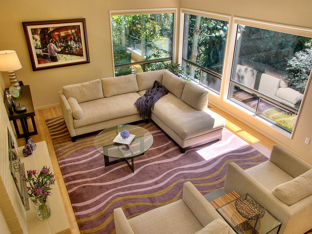 Tapis fait main violet arménien Tufenkian dans un salon moderne.