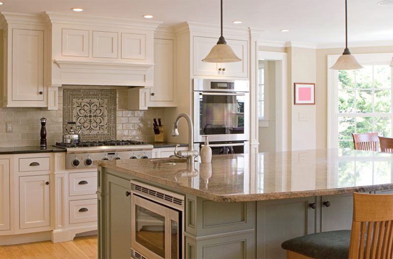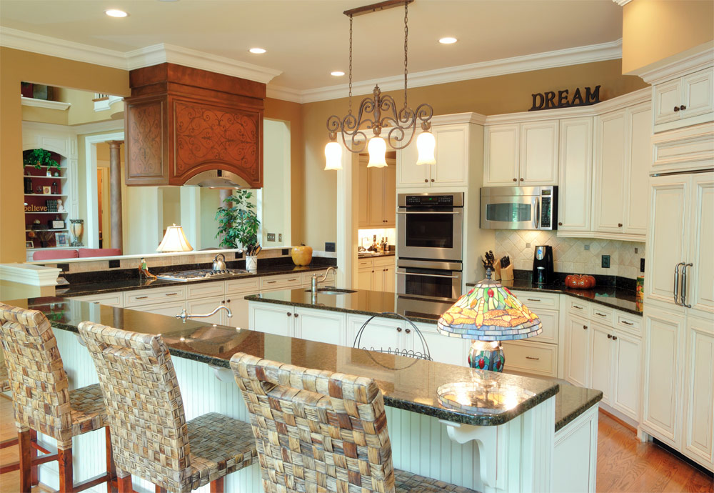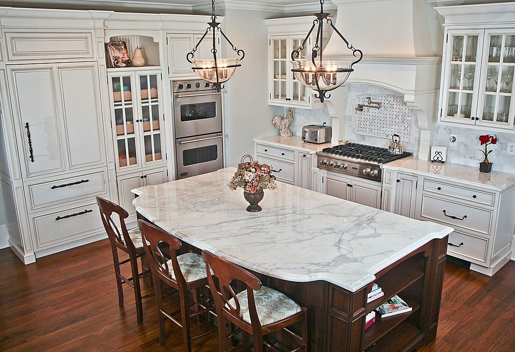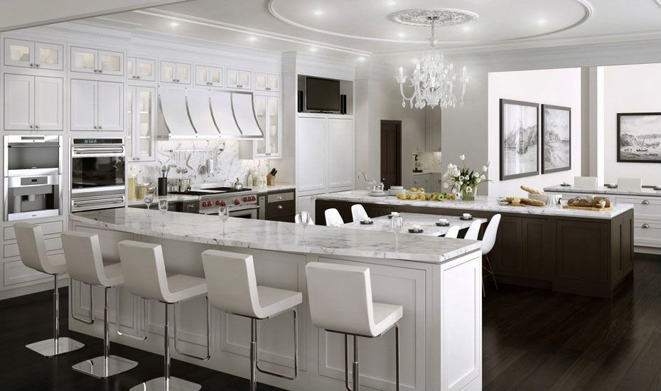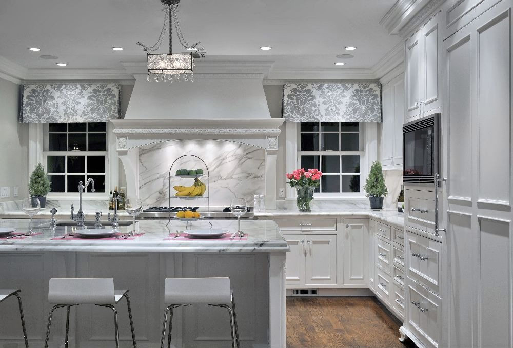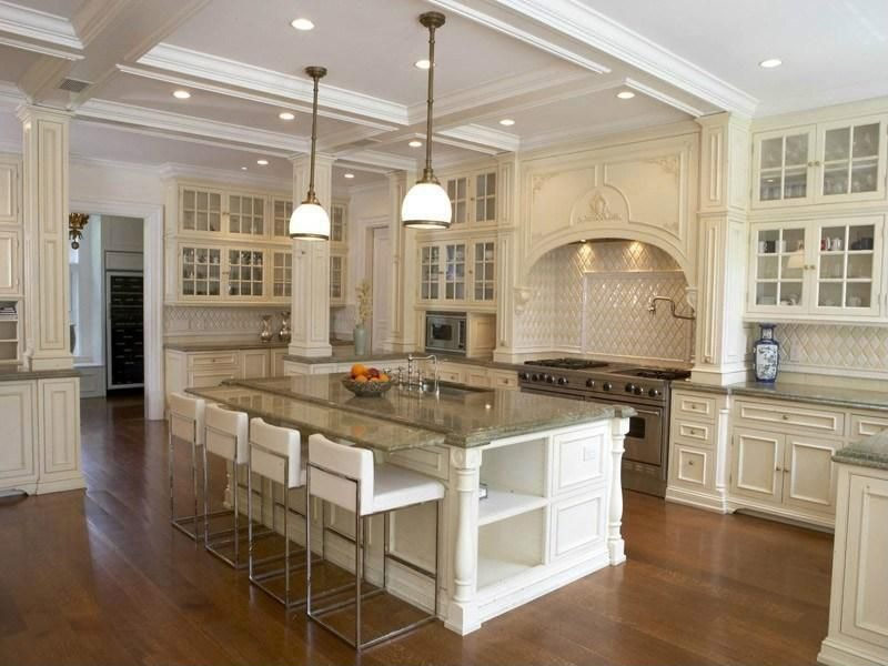 Cuisine blanche superbement décorée avec un mobilier en bois en filigrane, des dalles de tablier à motifs et un plafond à caissons dominant une grande table en îlot avec des comptoirs en marbre (Source: Zillow DigsTM).
