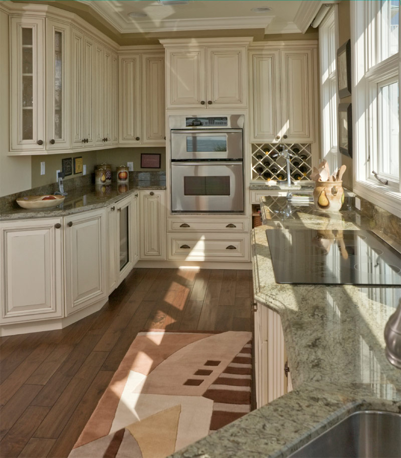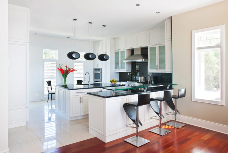 Cuisine contrastée avec un mobilier blanc brillant et un tablier, des comptoirs en marbre beige et un sol en bois foncé.
