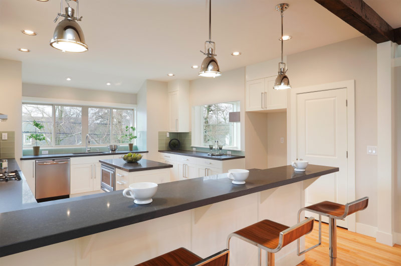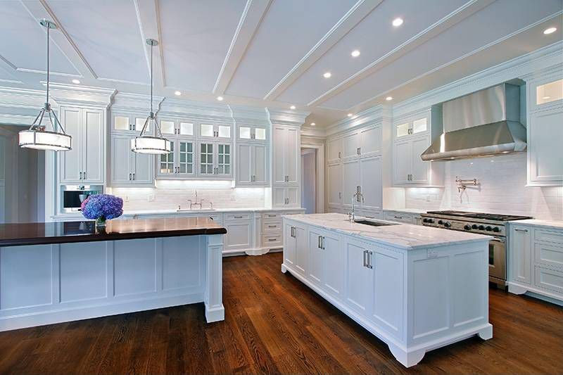 Cette cuisine en bois blanc comporte deux îlots: l’un avec un comptoir en marbre gris foncé et un évier encastré, le second pour manger avec un comptoir en bois foncé surélevé (Source: Zillow DigsTM).