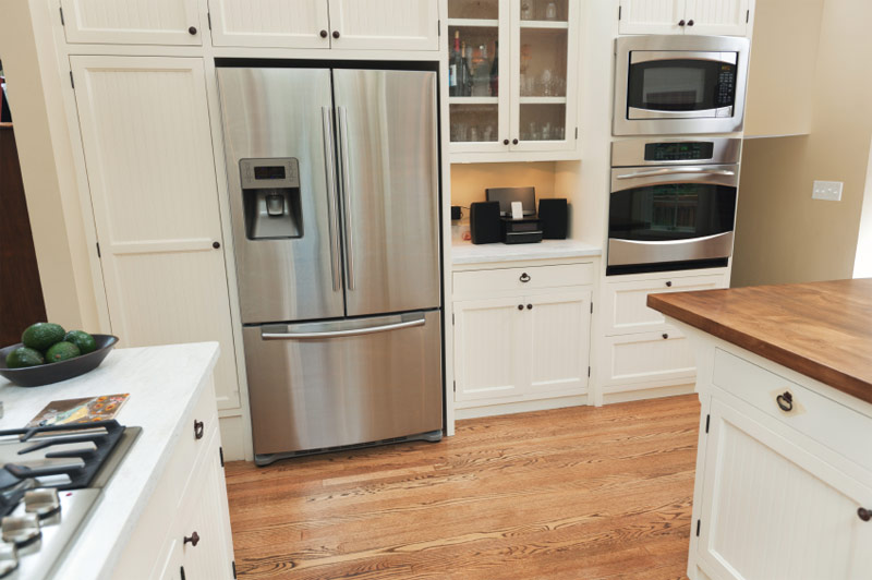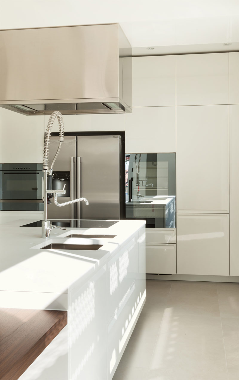 Un comptoir de lumière en bois naturel est le reflet d'un parquet de même teinte dans cette cuisine, où la couleur blanche du meuble est entrecoupée d'aluminium brossé par des appareils électroménagers.
