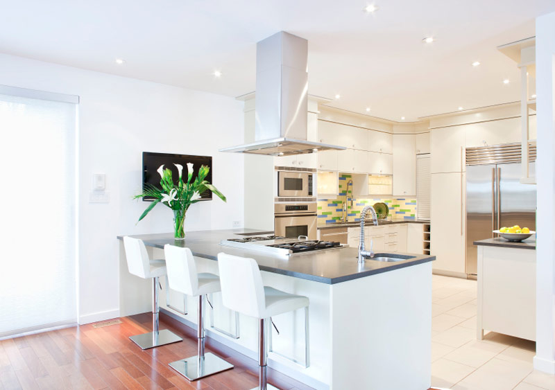 Les meubles, les murs et le plafond de cette cuisine semblent tout simplement blancs comme neige. Ils sont recouverts d’un plancher en bois naturel et d’un comptoir sombre sur l’une des tables de l’île (Source: Zillow DigsTM).
