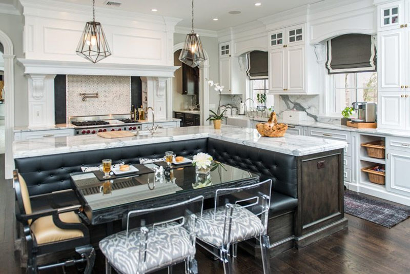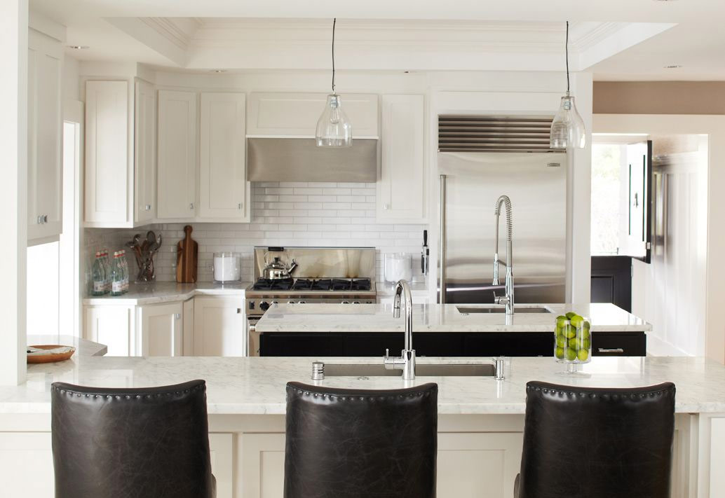 Des armoires blanches, des comptoirs en marbre et un tablier carrelé en brique font de cette cuisine un espace unique et intégré. Le blanc est dilué avec des éléments contrastés - chaises en cuir noir et la même île couleur de la table.