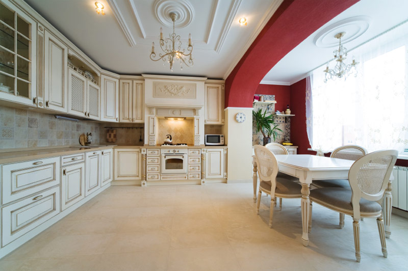 La principale "maîtresse" de cette cuisine de luxe avec sol en marbre et plafond en relief est, bien sûr, un superbe mobilier blanc avec des éléments dorés superposés.