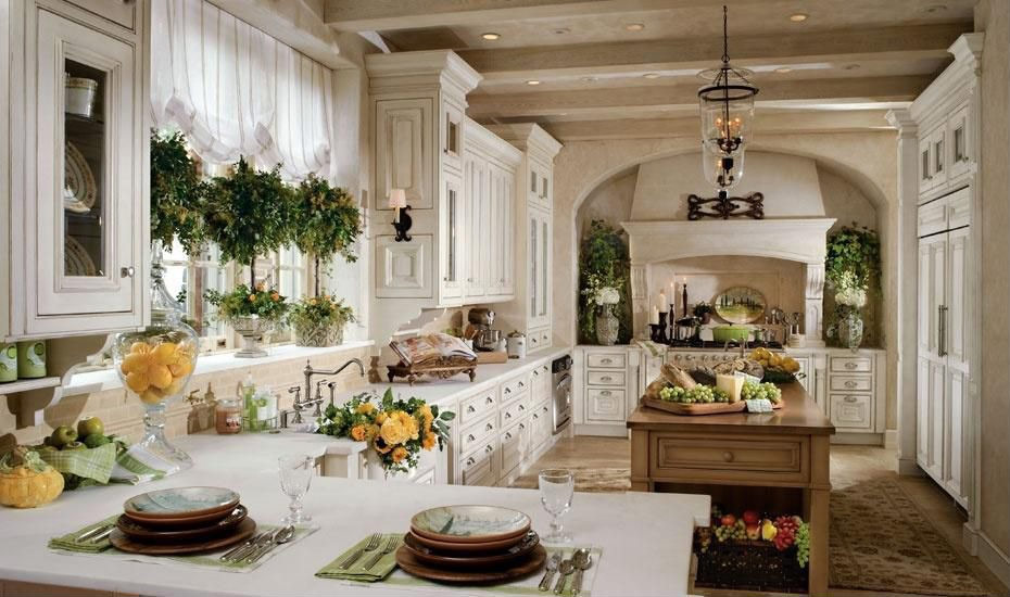Cuisine de style campagnard spacieuse avec armoires blanches contre des murs jaune moutarde. (Cette photo sur le site anglais se trouve devant le texte, immédiatement après le titre).