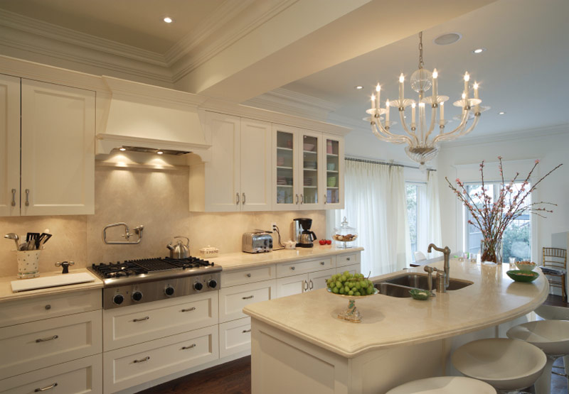 Une table en marbre avec un évier encastré, située sous un lustre plutôt massif, et une illumination cachée des plans de travail rendent cette cuisine confortable, confortable et différente des autres.