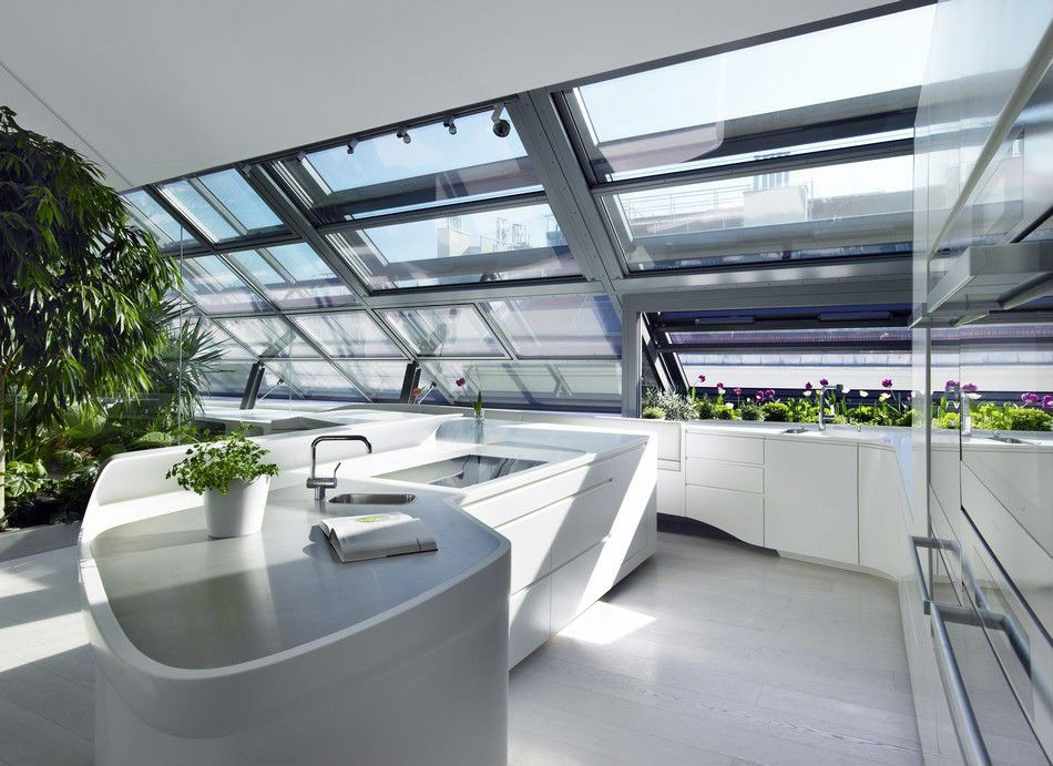 Dans cette cuisine ultramoderne, des meubles incurvés de couleur blanche et un sol en bois teinté de blanc donnent une apparence très organique au fond de grands panneaux de verre inclinés faisant partie du toit en pente (Source: Zillow DigsTM).