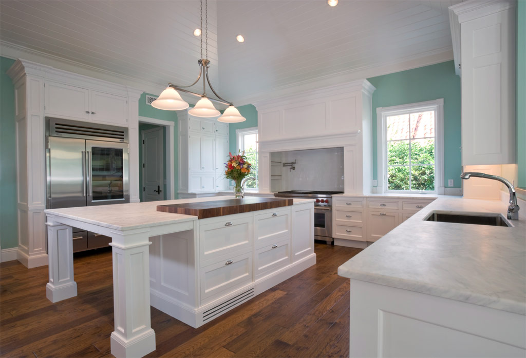 La peinture bleu-vert clair sur les murs et le plancher de bois franc ajoutent une touche de couleur à cette cuisine blanche.