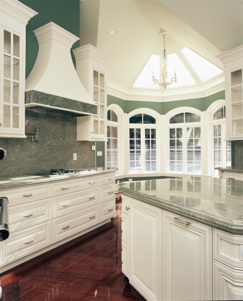 L'intérieur de cette cuisine classique blanche avec un tapis décoré de motifs géométriques sur un sol en bois foncé, des comptoirs en marbre vert clair et une cave à vin encastrée présente une teinte rétro claire que ne renforcent que les armoires blanches à portes sculptées.
