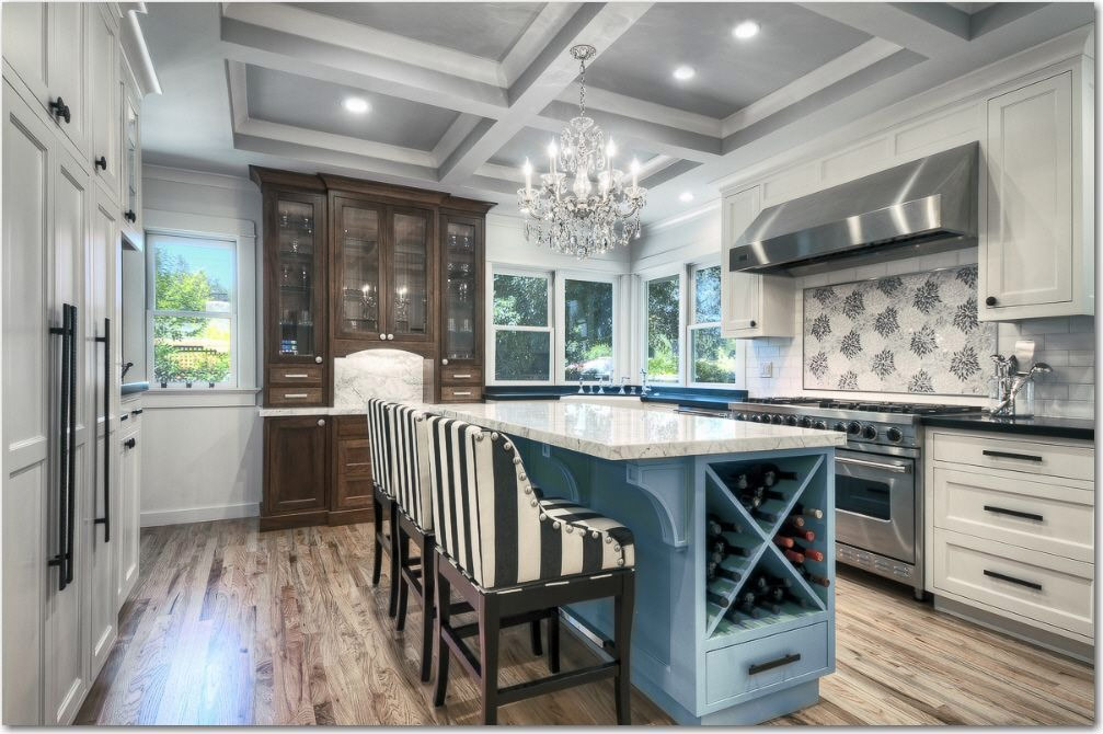 L'unicité de cette cuisine blanche provient de la table bleu ciel positionnée de manière centrale avec un comptoir en marbre et une cave à vin intégrée (Source: Zillow DigsTM).