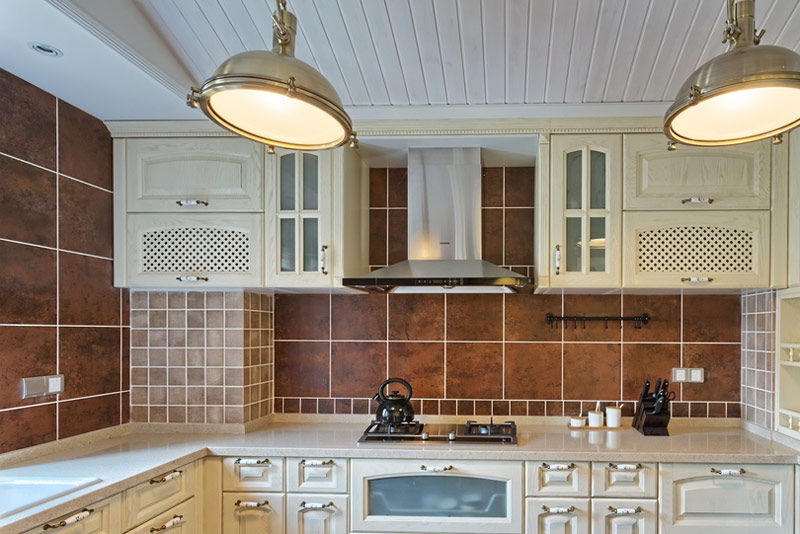 Dans cette cuisine confortable, le mobilier blanc de haute qualité contraste avec un riche carrelage marron décoré avec un tablier et un sol. Les portes d'armoire en verre fumé ajoutent de la texture.