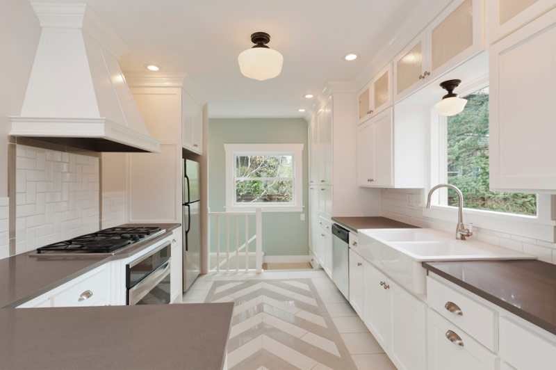 Dans cette cuisine, le marbre blanc utilisé pour la fabrication de plans de travail et un grand tablier contrastent avec le parquet en bois sombre aux couleurs naturelles (Source: Zillow DigsTM).