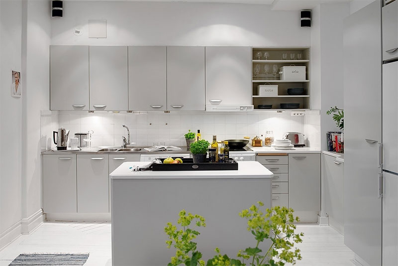 Lorsque vous essayez d'imaginer le style scandinave, la première chose qui vient à l'esprit est le blanc. Comme nous l'avons mentionné précédemment, ce style est né au bord d'un climat rigoureux, ce qui a dicté le choix de cette couleur particulière: les propriétaires des maisons souhaitaient que leur maison soit spacieuse, lumineuse et qu'elle oublie le froid et le crépuscule à l'extérieur. Dans cette situation, le choix le plus évident est le blanc, car il maximise la lumière naturelle disponible tout en minimisant la fragmentation visuelle. Puisque le blanc est déjà la couleur la plus populaire dans la conception de la cuisine, la plupart d’entre nous n’auront aucun mal à changer de style.