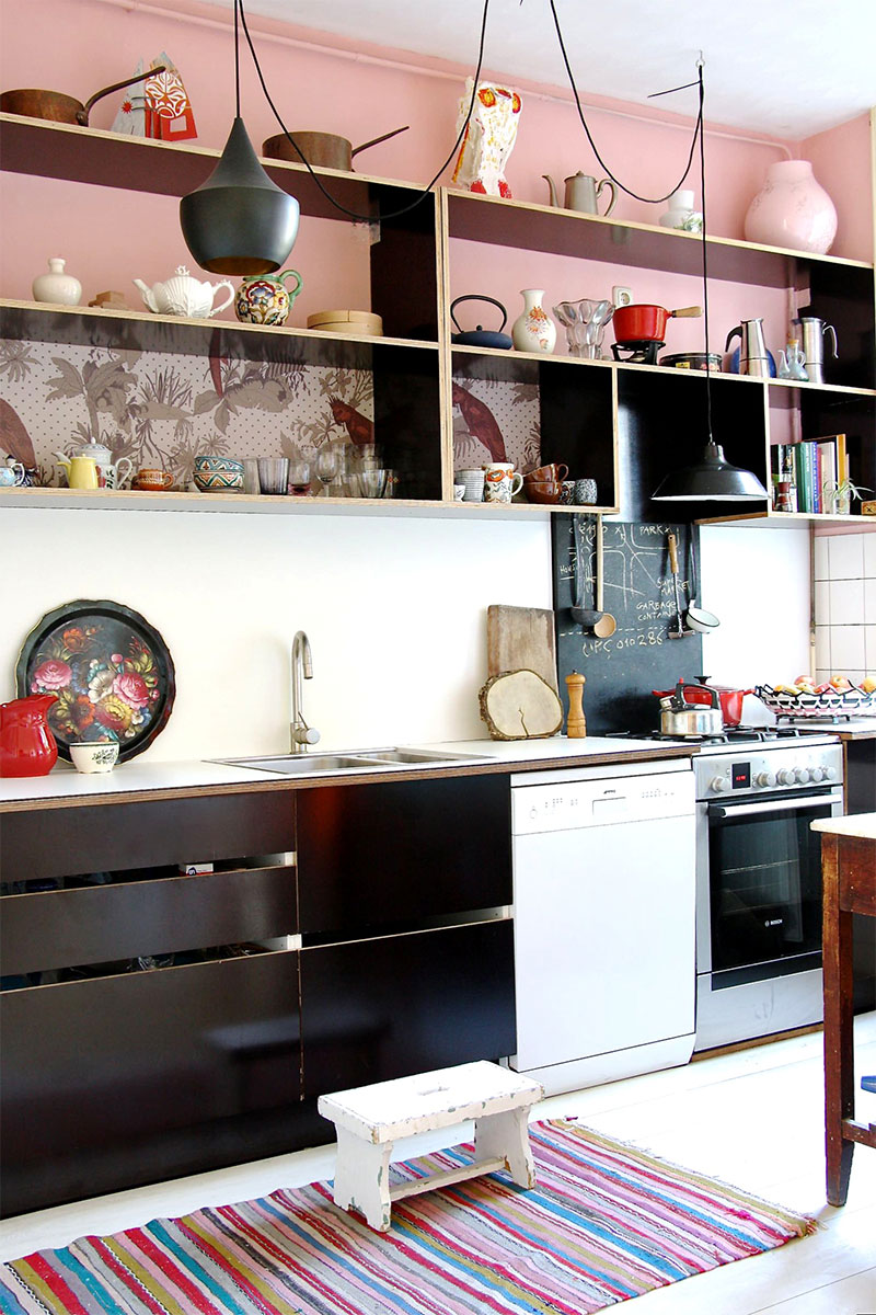 Palette noire et rose dans la cuisine scandinave (par Holly Marder).