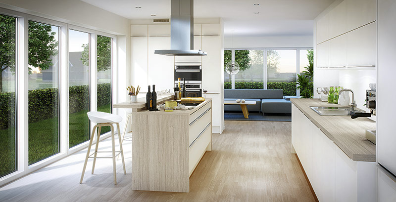Grâce aux grandes fenêtres, cette cuisine semble particulièrement lumineuse et aérée et surprend simplement par son espace libre. Le design scandinave ultramoderne dans toute sa splendeur! (de Marbodal).