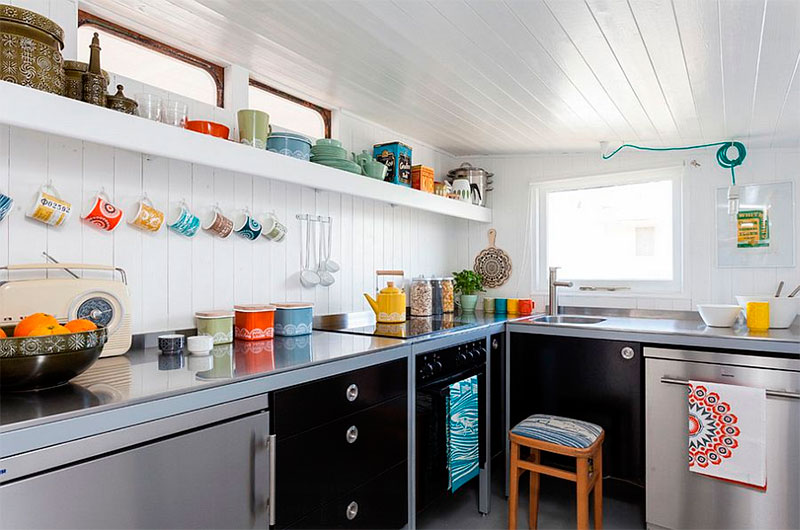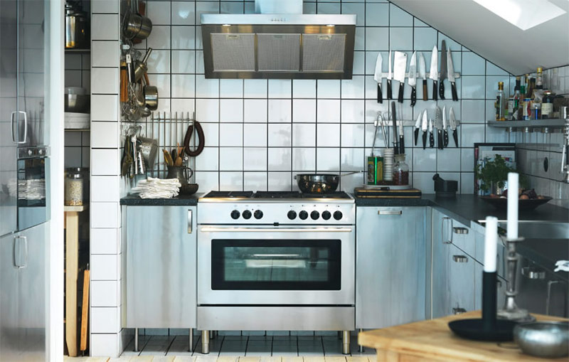 Malgré l'abondance de pièces métalliques, cette cuisine ne semble pas austère, mais a un aspect plutôt habité, bien qu'avec une touche de style industriel. Ceci est en grande partie facilité par l'utilisation judicieuse de la surface du mur pour stocker les ustensiles de cuisine (de IKEA).