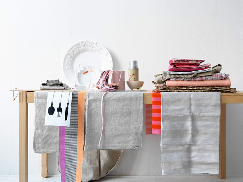 Textiles dans la cuisine scandinave. De nombreuses serviettes et serviettes (certaines avec des couleurs et des motifs vifs) ajoutent de la couleur à l’intérieur blanc comme neige (tiré de Furnish Burnish).