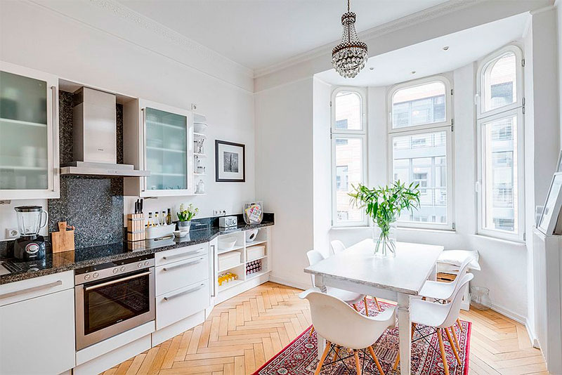 De nombreuses cuisines scandinaves utilisent des détails structurés pour donner à la pièce une personnalité et une chaleur chaleureuse. Le moyen le plus simple d'ajouter de la couleur et des motifs est le textile. Et après avoir acheté un tapis scandinave, par exemple, suédois, vous introduirez à la fois dans votre intérieur non seulement la couleur et le motif, mais également une texture supplémentaire. En général, les éléments faits à la main et les motifs tissés rendent l’intérieur plus intéressant et constituent un excellent contraste avec les détails plus modernes.