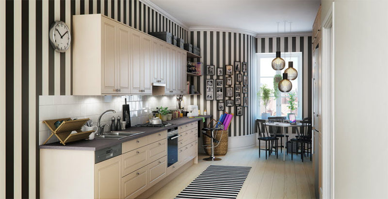 Dans cette cuisine scandinave, les bandes du tapis s'étendent jusqu'aux murs, les rendant bicolores et donc plus intéressantes! Remarquez comment des meubles de cuisine blancs, une horloge de style rétro et trois suspensions rafraîchissent le look classique de la pièce (de Marbodal).