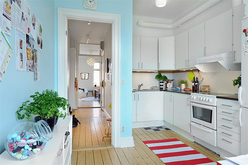 La cuisine aux tons bleus clairs est parfaitement complétée par un tapis à rayures rouges et blanches posé sur un sol en bois naturel (de Pedantique).