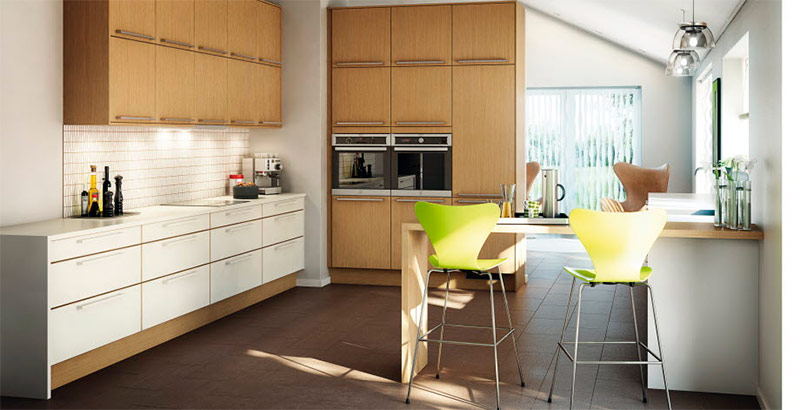 Les chaises vert lime ne sont pas la seule "attraction" de cette cuisine! Les armoires en chêne se détachent des murs et des tiroirs blancs (de Marbodal).