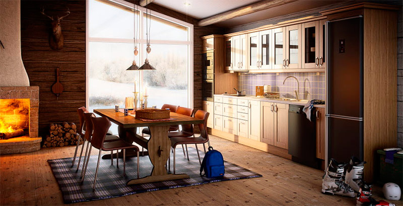 Parfois, les intérieurs en bois créent le sentiment d'être dans une maison rustique, surtout si la pièce a une cheminée et des textiles à carreaux! Dans cette cuisine de style scandinave, le charme d'un pavillon de chasse est facile à créer grâce aux murs et aux sols en bois. Par conséquent, la tête d'un cerf ici est plus que convenable ... (de Marbodal).