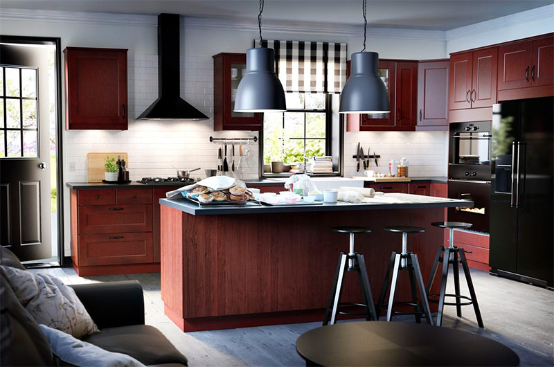 Cuisine scandinave moderne avec meubles en bois, garnitures noires et suspensions. La couleur blanche des murs garantit une image plus spectaculaire et frappante plutôt que lourde et stricte (de IKEA).