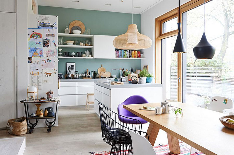 En règle générale, les «couleurs de l'été» s'intègrent bien au style scandinave, mais des teintes encore plus vives semblent également tout à fait appropriées ici, à condition qu'elles soient utilisées modérément. Rappelez-vous que dans le style scandinave classique, la modération est généralement l’une des règles principales à respecter de manière irréprochable. Les armoires de couleur vert pâle ou bleu clair ainsi que les chaises correspondantes dans la salle à manger adjacente constituent une transition vers un tout nouveau niveau!