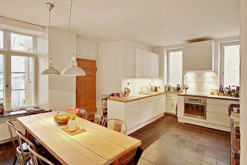 Certains propriétaires aiment associer style scandinave et style rustique, tandis que d'autres préfèrent une approche plus moderne du design de la cuisine. Quelle que soit votre idée de la cuisine scandinave parfaite, l'éclairage de l'espace devrait être au top. C'est un éclairage qui peut créer ou détruire le look scandinave de votre cuisine. Les grandes fenêtres sont la marque de ce style, le flux de lumière naturelle est toujours le bienvenu ici! Ajoutez quelques suspensions (actuellement à la mode pour les structures en métal) et un éclairage encastré chaleureux, et vous obtiendrez l'endroit idéal pour cuisiner et manger.