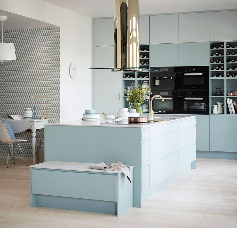 Îles vert menthe dans une cuisine blanche (de Emma Persson Lagerberg).
