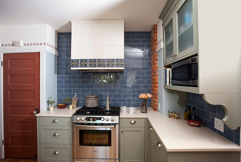 Design scandinave dans les tons bleus. Une bordure florale n'est pas simplement une décoration, mais un hommage au passé, car cette cuisine est située dans une maison construite en 1908 (de Brit Amundson via TreHus Architects + Interior Designers + Builders).