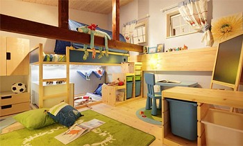Les murs ondulés et les paniers en osier sont parfaitement combinés avec un tapis à rayures blanches et bleu foncé, formant un thème marin commun (de Marbodal).